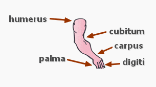 3. In humeró vidémus: carpus, cubitum, humerus, manus. In manú palmam et digitós habémus.