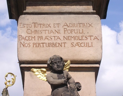 Nápis, na který se dnes podíváme, velice dobře znají studenti latiny na broumovském gymnáziu. Jedná se totiž o nejkratší a nejjednodušší latinský nápis na mariánském sloupu na Mírovém náměstí v Broumově. Vypadá takto: