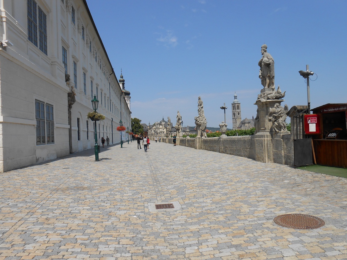 Přístupová cesta k chrámu sv. Barbory je vskutku úchvatná. Po pravé straně rozsáhlá budova jezuitské koleje, po levé straně překrásný výhled na protilehlé lesy a před vámi majestátný chrám sv. Barbory. Levá strana je navíc lemovaná sousošími svatých, kolem každého sousoší jsou pak latinské nápisy, obvykle nejméně 4..<>